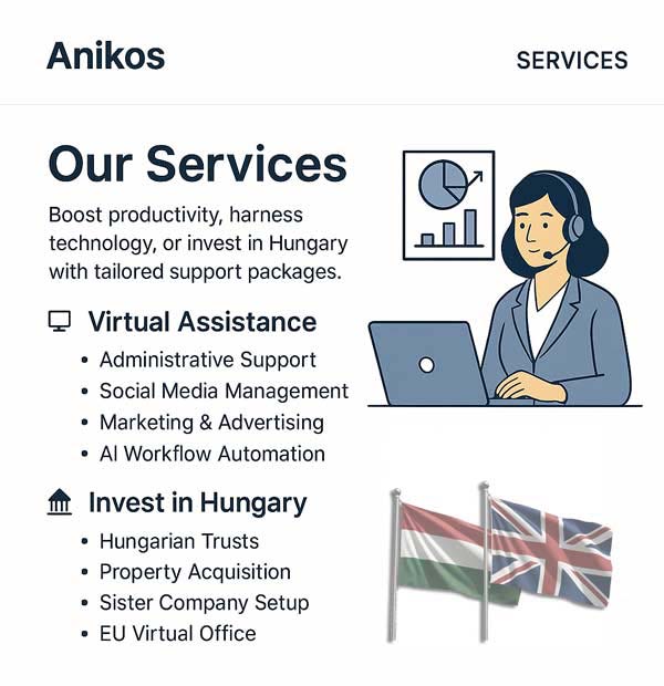 Anikos is your virtual office wing – a highly capable, bilingual team based in Hungary offering a full spectrum of services to UK-based businesses and global entrepreneurs.